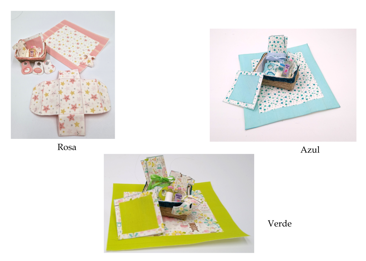 Kit para realizar una canastilla de bebé. Incluye mantita, cambiador, pańales, baberos, body y chambrita, además de una cesta, biberón y aceite de bańo. Disponible en rosa, azul y verde con estampado unisex.